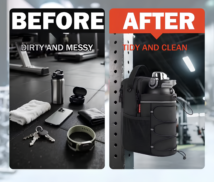 “Sticks firmly to racks and benches — no more bottle on the dirty floor. Pocket fits my shaker and basics; super convenient.”